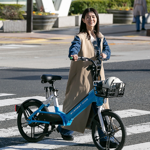 見た目は自転車。でもペダルはありません。アクセルをひねるだけで、スムーズに軽やかに走り出す。最高速度は20km/hで、車道も自転車道も自由に走行可能。定格出力500Wのパワフルモーター搭載で、坂道もラクラク登れて汗知らず。